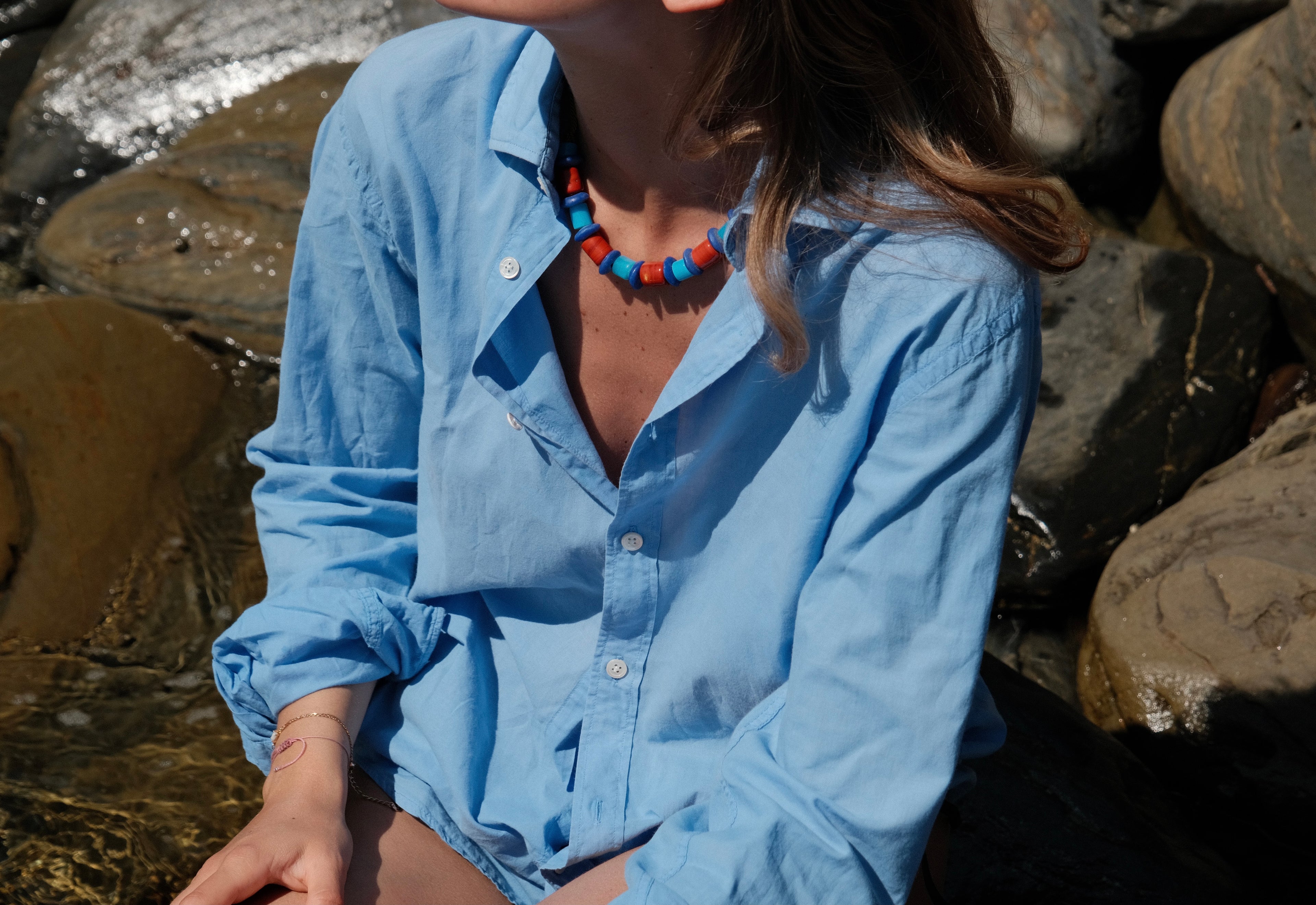 Mais très vite, je me suis rendu compte que ces colliers attiraient l’attention et la curiosité des gens. Beaucoup de compliments et d’interrogations. Souvent on me demandait d’où ils venaient, s’ils étaient faits main, si c’était moi qui les avais créés. C’est là que l’évidence m’a frappée : je ne pouvais pas les garder pour moi. Je me suis mise à mes heures perdues à en fabriquer, un à un, tout en gardant l’esprit brut et artisanal de l’origine de ces perles, afin d’en partager un plus grand nombre pour les personnes intéressées.
